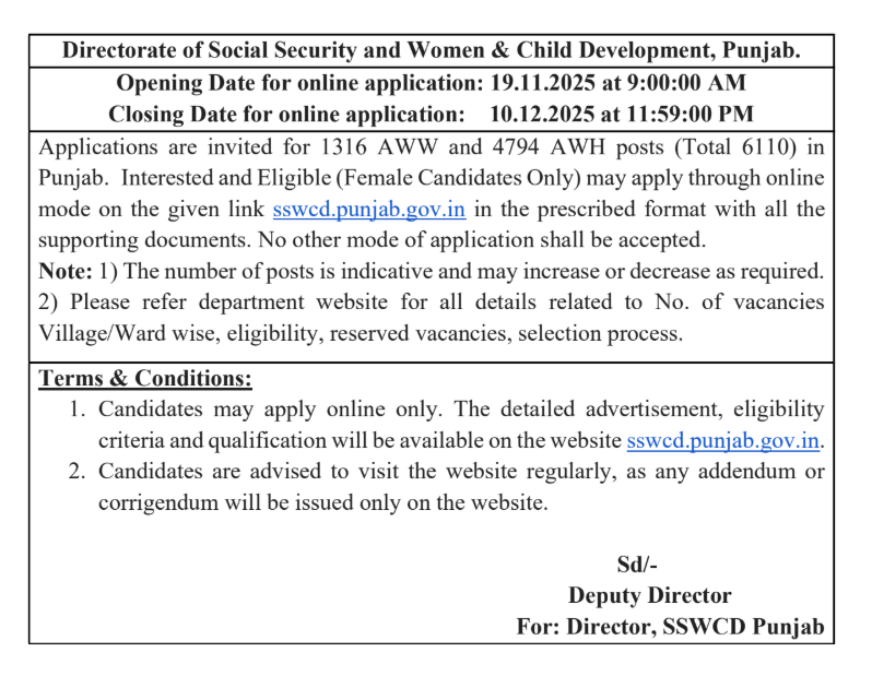 Anganwadi Vacancy 2025 :- Women and Child Development Department (WCD) ने Anganwadi Worker (AWW) और Anganwadi Helper (AWH) के कुल 6110 पदों पर भर्ती के लिए आधिकारिक अधिसूचना जारी कर दी है। जो भी उम्मीदवार Anganwadi Vacancy 2025 के लिए आवेदन करना चाहते हैं, वे 19 नवंबर 2025 से 10 दिसंबर 2025 तक ऑनलाइन आवेदन कर सकते हैं।