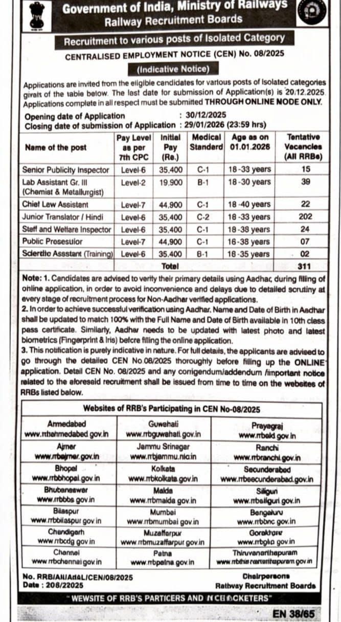 RRB Isolated Categories Recruitment 2026 रेलवे में सरकारी नौकरी की तैयारी कर रहे अभ्यर्थियों के लिए एक बेहतरीन अवसर है। Railway Recruitment Board (RRB) द्वारा Isolated Categories के अंतर्गत विभिन्न महत्वपूर्ण पदों पर भर्ती के लिए CEN No. 08/2025 का शॉर्ट नोटिस जारी कर दिया गया है। इस भर्ती प्रक्रिया के माध्यम से कुल 311 पदों पर योग्य उम्मीदवारों का चयन किया जाएगा।